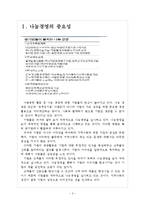 목차 목 차 Ⅰ. 나눔경영의 중요성 3 Ⅱ. 한국가스공사 사례 4 Ⅲ. 석유공사 사례 5 Ⅳ. 사회공헌 패러다임 변화 6 Ⅴ. 해외 사회공헌활동 증가 6 본문 Ⅰ. 나눔경영의 중요성 사회공헌 활동 등 나눔 경영에 대한 기업들의 관심이 높아지고 있다. 나눔 경영은 단순히 '생색내기용' 이벤트가 아니라 기업의 지속 성장을 위한 중요한 경영 활동으로 자리매김하는 중이다. 사회와 함께하지 않으면 기업도 생존할 수 없다는 인식이 확산되고 있는 것이다. 기업들은 과거와 달리 보다 적극적으로 나눔경영을 실시하고 있다. 나눔경영을 보다 체계적인 방법을 통해 효과적으로 시행하고 있는 것이다. 이러한 영향은 특히 공기업에서 활발하게 이루어지고 있다. 과거에 기업은 자사의 이익만을 추구하며 지역사회에 대한 지원과 관심은 부족했다. 기업의 이익에만 몰두하여 지역사회가 겪고 있는 문제에 대해서는 아무런 관심을 가지지 않은 것이다. 참고문헌 참고자료 http://www.hankyung.com/news/app/newsview.php?aid=2013022788891 <한국경제> http://www.dt.co.kr/contents.html?article_no=2013030502013269614001 <디지털타임스> http://www.hankyung.com/news/app/newsview.php?aid=2013022788721 <한국경제> http://www.etoday.co.kr/news/section/newsview.php?idxno=694956 <이투데이> http://www.etoday.co.kr/news/section/newsview.php?idxno=694974 <이투데이> http://www.etoday.co.kr/news/section/newsview.php?idxno=694969 <이투데이> http://www.etoday.co.kr/news/section/newsview.php?idxno=694964 <이투데이> http://news.heraldcorp.com/view.php?ud=20130221000112&md=20130224004249_AN <헤럴드생생뉴스> http://www.ccdailynews.com/sub_read.html?uid=317506§ion=sc2 <충청일보> http://www.gasnews.com/news/articleView.html?idxno=60161 <가스신문> 하고 싶은 말 공기업나눔경영 공기업의 사회환원 영향과 전망 보고서 키워드 공기업, 사회공헌, 사회환원, 나눔경영 |