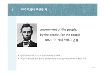 목차 01 민주주의란 무엇인가 02 문제제기 2.1 대의민주주의가 갖는 기본적 한계 2.2 우리나라 현 정부에서 나타나는 문제 03 현상분석 3.1 공식적 부문 3.2 비공식적 부문 04 결론 4.1 전자민주주의 4.2 시민들의 정치적 역량 강화 4.3 정책 매개기관의 성장 05 Q&A 본문 민주주의란 무엇인가 government of the people, by the people, for the people- 1863. 11 게티스버그 연설 민중이 권력을 가지고 스스로 권력을 행사하는 정치체제 국민의 기본적 인권 존중, 권력의 전제화를 억압할 수 있는 민주적인 정치제도의 확립이 요구 문제제기 01 대의민주주의가 갖는 기본적 한계 전문성의 부족 현대사회의 전문성과 복잡성 증대 제주도의 1문1답 도정질문제도 3) 다수결의 함정 다수에 의한 횡포 최선의 결과를 보장하지 못함 선거 외의 정치적 참여수단 부족 루소 曰 "사람들은 투표장에 들어갈 때는 주인이 되지만 투표 후에는 또 다시 노예가 된다" 키워드 문제점, 민주주의, 우리나라, 고찰, 전자민주주의 |