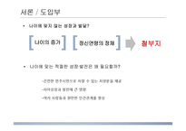 목차 서론 도입부 본론 성인기의 분류 및 특성 신체적 변화 및 요인 정신적 변화 및 요인 건강을 위한 대처 방안 건강과 관련된 광고 결론 요약 및 마무리 참고문헌 본문 초기 성인기(20대 후반~50세) 중요한 인생 변화(직업, 가족 형성) 고등교육을 마치고 직업을 가져 경제적인 독립을 이룸 사랑하는 이성을 만나 결혼을 하고 가족을 형성 ↓ 중년기 (40세~65세) 인생의 선택이 좁아지는 시기(샌드위치, 빈둥지) 자녀들은 집을 떠나고 삶의 경로가 보다 고정 But 개인내 가소성에 따라 다른양상을 보임 (활동적/낙관적인 유형 위축/부정적인 유형) 참고문헌 ※참고문헌 (1) 생활건강, 중앙대학교 약학대학, 2005 신일상사 (2) 성인발달과 생애설계, 2006 김애순, 시그마프레스 (3) 성인 노인 심리학, 2002. 윤진, 중앙적성출판사 (4) 정신건강론(성인기 정신건강) (5)국가건강정보포털 (6) http://blog.naver.com/side716/50122731376 (7) 성인발달과 생애설계, 김애순 저, 2002, 시그마 프레스 (8) 생애발달 Ⅱ, Laura E. Berk 지음, 이옥경 박영신 이현진 김례리 정윤경 (9) 김민희 옮김, 2009, 시그마 프레스 (10) http://cafe.naver.com/funnyedu.cafe (11)http://cafe.naver.com/funnyedu.cafe?iframe_url=/ArticleRead.nhn% (12)http://blog.naver.com/artppper?Redirect=Log&logNo=140057032890 키워드 대중광고, 성인심리, 성인기, 영향요인, 성인 |