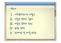 목차 Ⅰ. 사회문제로서의 저출산 Ⅱ. 저출산 문제의 실태 Ⅲ. 저출산 문제의 원인 Ⅳ. 관련 정책 Ⅴ. 한계점 및 해결 방안 본문 1. 사회문제로서의 저출산 영상을 보시라요~ "베이비푸어 젊은 부부들 아이키우다 빚더미" http://news.naver.com/main/read.nhn?mode=LPOD&mid=tvh&oid=055&aid=0000220719 *저출산의 무엇이 문제인가? ①고령사회로의 진입 ②생산인구를 감소 → 소비시장이 위축 → 사회체계 붕괴 ③노인인구의 증가 → 부양비 부담 증가 → 청년층과 노년층의 조화 불가능 *저출산의 원인은 무엇인가 ? ①직장문화 - 보장되지 못한 출산 휴가와 육아 휴직 등 때문에 가정과 직장의 양립이 현실적으로 어렵다. ②부족한 한국의 국공립 양육시설의 수 - 아이들을 키울 수 있는 양육시설이 부족해 특히 맞벌이 부부들은 아이를 기르는 데에 있어 부담을 느낀다. ③ 사교육열풍과 비용 - 지나친 교육열이 부모로 하여금 아이들을 키우는 데에 큰 경제적 부담을 준다. 참고문헌 *보건복지부 홈페이지 http://www.mw.go.kr/front_policy/jc/sjc0109mn.jsp?PAR_MENU_ID=06&MENU_ID=0609020101 *이동석, 2011, 한국의 저출산 정책 방향에 관한 연구, 서울시립대학교 도시과학대학원 *http://www.google.com/search?q=low+birth+rate&hl=en&prmd=imvns&source=lnms&tbm=isch&ei=hoW7T9i1MceUiQeS6cTpCA&sa=X&oi=mode_link&ct=mode&cd=2&sqi=2&ved=0CGIQ_AUoAQ&biw=1366&bih=674-각종 표 *http://news.naver.com/main/read.nhn?mode=LPOD&mid=tvh&oid=055&aid=0000220719-동영상 *네이버 백과사전,-저 산 * 키워드 성인기, 저출산, 문제, 사회학, 고찰 |