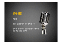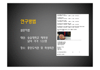 목차 가설설정 연구방법 심층면접 결론 본문 연구방법 가설1, 남녀의 동전 소지, 사용빈도, 인식에는 차이가 있을 것이다. 가설2, 이러한 차이는 한국의 남성과 여성에 대한 이미지, 고정관념에서 비롯될 것이다 * 설문지법 (대상 : 숭실대학교 학생 남자 : 100명, 여자 : 100명) 1. 설문지 질문의 의도를 설정하여 순서대로 배치. (1~5 동전의 소지, 유용성, 6~8 동전의 이미지와 남녀 인식차이) 2. 설문결과를 점수화해 그래프로 나타내어 남,녀간의 차이를 찾고 분석. (예 : 1번 = 0점 2번 = 1점 3번 2점 4번 3점 5번 4점 X 1???) (① 전혀 그렇지 않다 ② 그렇지 않다 ③ 보통이다 ④ 그렇다 ⑤ 매우 그렇다) 키워드 남녀, 차이, 동전, 연구, 소지, 가설설정, 연구방법, 심층면접 |