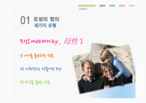 목차 모성이란? 모성의 현실 대 안 본문 모성 maternity , 母性 1) 아이를 출산하는 작용 2) 사회적으로 만들어진 모성 3) 자식을 돌보는 작용 긍 정 여성의 실제적인 경험과 사회, 문화적 위치로 모성에 대한 시각을 바르게 정의하여야 한다. 또한, 현시점에서의 현실적인 모성문제, 즉 자녀양육과 관련된 현실적 문제에 대한 전반적 검토가 필요한 실정이다. 드라마나 영화는 은연중에 눈에 보이지는 않지만 보다 강하게 어떤 관념을 사람들에게 심어준다 키워드 현대모성, 모성, 문제점, 한국사회, 현대 |
