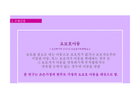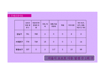 목차 주제선정의 이유 지역사회의 특성 분석 지역사회의 욕구와 문제 정서지지 프로그램 분석 강남구 지역 프로그램 적용 부록 참고문헌 본문 요보호아동 * 보건복지부 2010년 요보호아동현황보고 보호를 필요로 하는 아동으로 보호자가 없거나 보호자로부터 이탈된 아동, 또는 보호자가 아동을 학대하는 경우 등 그 보호자가 아동을 양육하기에 부적합하거나 양육할 능력이 없는 경우의 아동을 말함 본 연구는 조손가정과 한부모 가정의 요보호 아동을 대상으로 함. (1) 욕구 및 현황 - 강남구의 요보호 아동 수가 통계상 791으로 가장 수치가 높다. - 강남구에 거주하는 미혼모의 수가 다른 지역에 비해서 많다. 물적자원 → 종합복지관이7개, 지역아동센터 10개, 청소년 관련 기관이10개 인적자원 ① 강남구 자원봉사활동 참여율 ② 강남구의 시민기부 2009년 강남구민의 기부율을 59.7%로 2007년에 비해 17.1%가 상승하였다. 참고문헌 - 강남구청 홈페이지: http://www.gangnam.go.kr - 강남구청 통계서비스: http://gss.gangnam.go.kr - 강남구 복지기관 홈페이지 프로그램 - 블로그 http://blog.daum.net/asan387/7387961 http://blog.daum.net/gbbae56/11806883 - 경향신문 ("서울 복지 수준 은평 종로 강동 강남구 순"= 이서화 기자 ) http://news.khan.co.kr/kh_news/khan_art_view.html?artid=201105192226525&code=950201 - 논문: 저소득가정의 환경적 지지가 아동의 정서 행동문제에 미치는 영향(2010, 고선주) - 학술논문: 지표로 본 서울의 지역특성과 발전방향 - 통계청 테마통계 대상별통계 여성가구수 가구주의 성/연령/혼인상태별 가구(일반가구) - 저소득층 아동의 사회적 지지와 자기효능감, 자기조절 능력과의 관계, 석사학위논문, 원희정, 2006 - 정서적 지지체계로서 집단예술치료가 지역아동센터 아동의 사회 적응에 미치는 효과, 석사학위논문, 장영미, 2011 - 사회복지 공동모금회, <2010년 배분지원사업 사례집>, 80p-84p 키워드 정서, 사회복지, 정서지지, 강남구, 아동 |