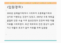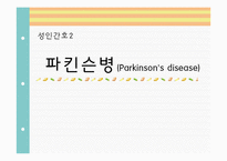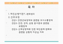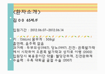 목차 1. 파킨슨병이란? 병태생리 2. 간호과정 진단1- 안면근육장애와 관련된 의사소통장애 진단2- 진전, 강직, 운동 완서증과 관련된 보행장애 진단3- 신체상장애로 인한 대인관계 변화와 관련된 상황적 자긍심 저하 본문 <환자소개> 김 0 0 65세/F 입원기간 : 2012.06.07~2012.06.14 키 : 156(cm) 몸무게 : 50(kg) 흡연력, 음주력 없음 과거력 : 두부외상(1987), 당뇨(1997) ,진전- 왼쪽발가락에서 시작하여 오른쪽 발가락과 상지로 이행 (2002) 입원당시 복용중이던 약물: 혈당강하제, 진전완화제 수술력 : 우측 대퇴골 골절 수술 (2007) <입원경위> 2002년 왼쪽발가락에서 시작하여 오른쪽발가락과 상지로 이행되는 진전이 있었고, 2007년 우측 대퇴골 골절로 인한 수술 이후 침상안정과 진전에 대한 약물 치료를 시작하였다. 최근 턱부위의 진전 증상이 심해지고 약물의 효과가 없어 치료를 위해 입원함 키워드 성인간호, 간호, 파킨슨병, 과정, 성인 |