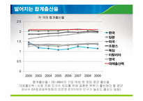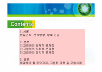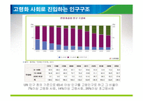 목차 1.서론 현실인식, 전개방향, 향후 전망 2. 본론 고령화의 경제적 문제점 고령화의 사회적 문제점 고령화의 정치적 문제점 3. 결론 해결해야 할 주요과제, 고령화 대책 및 모범사례 본문 고령화 사회로 진입하는 인구구조 UN 인구 정의 기준으로 65세 이상 인구를 고령인구로 하고 그 비율이 7%이상 고령화 사회, 14%이상 고령사회, 20%이상 초고령사회 떨어지는 합계출산율 합계출산율 : 15~49세의 가임 여성 한 명당 평균 출산율 대체출산력 : 사회 전체 인구수 유지를 위해 결혼한 부부가 출산해야 할 평균 자녀수 (유럽경제위원회의 따르면 2.1이어야 인구가 늘지도 줄지도 않음) 키워드 고령화, 문제점, 고령, 출산율, 이상 |
