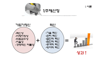 목차 Ⅰ서론 1.주제선정 2.주제선정동기 및 배경 Ⅱ본론 1.기업가 정신의 개념 2.혁신의 개념 3.기업가정신이 혁신에 미치는 영향 4.경영혁신이 경영성과에 미치는 영향 Ⅲ결론 1.연구결과 및 시사점 본문 1.주제선정 기업가정신에는 크게 5종류의 속성으로 분류해서 볼 수 있는데 크게 혁신성, 미래지향성, 위험감수성, 자율성, 경쟁적인 저돌성이다. 그리고 혁신의 종류도 여러가지로 분류해보며 기술혁신, 관리혁신, 급진적 혁신, 점진적혁신, 공격적혁신, 방어적혁신으로 볼 수 있다. 기업의 성공과 품질성과 향상에 가장큰 영향을미친다고 생각할 수 있는 것이 기업가정신과 혁신이라고 판단하였다. 그러나 이런 기업과정신과 혁신이 개별적인 발생으로 영향을 미치는 것이 아니라 기업가정신으로 혁신을 만들어 내고 이 혁신이 기업성과와 품질향상에 영향을 미치는 연속선상의 관계에 있다고 생각을 했기 때문에 이 주제를 선정하게 되었다. 기업가정신 - 조직체에서 지속적인 창조적 파괴과정에서 중심 적 역할을 수행하는 것. - 기업가를 경제발전의 원동력이라고 주장하면서 기업가의 역할을 혁신이라고 규정. - 기업가의 과제를 낡은 것을 파괴하고 새로운 전 통을 창조하는 혁신가, 즉 '창조적 파괴자'로 규정. 하고 싶은 말 지난 1학기 품질경영 강의 발표자료입니다. 발표주제는 기업과 정신과 혁신이 품질향상에 기여하는 것으로 잡아서 여러 논문을 조사해 그 논문을 토대로 저희나름의 결론을 내려서 정리하여 발표했습니다. 열심히 준비하여 발표한 자료이니 유용한 자료 되시길^^ 키워드 품질경영, 기업가정신, 혁신, 품질향상, 논문 |