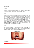 목차 영아기 피부질환 I. 아구창 1. 원인 2. 증상 3. 치료와 관리 II. 기저귀 발진(기저귀 피부염) 1. 원인 2. 증상 3. 치료와 관리 III. 아토피성 피부염 1. 원인 2. 분류 3. 증상 4. 치료와 관리 1) 피부 보습 증진 2) 가려움증 완화 및 2차 피부감염 예방 3) 알레르기원 제거 4) 식이조절 5) 약물투여 6) 부모 지지 * 참고문헌 본문 영아기 피부질환 I. 아구창 아구창(oral candidiasis, thrush)은 영아기에 매우 흔한 구강 점막의 감염으로 신생아의 2-4%에서 나타나며, 모유 수유아보다 젖병 수유아에서 더 많이 발생한다. 1. 원인 아구창은 칸디다균이 몸속에서 지나치게 증식하여 증상이 나타나는 것이다. 건강한 사람의 구강과 위장관에는 칸디다균이 존재하며, 인체의 면역기전과 몸에 유용한 박테리아에 의해 그 양이 일정하게 조절되고 있다. 만약 질병이나 면역억제제와 같은 약물투여에 의해 면역체계가 약해지거나 항생제의 장기간 사용으로 몸에 유용한 균주가 파괴되는 경우, 구강 및 위장관에 있는 칸디다균이 과잉 증식함에 따라 감염 증상을 일으키게 된다. 신생아는 분만 시 모체의 질강을 통해 아기의 입으로 유입되거나, 오염된 젖꼭지, 어머니의 유두 등을 통해 감염된다. 또한 양육자가 화장실 사용 후 손을 씻지 않거나 아기용품을 불결하게 관리할 때도 발생할 수 있다. 특히 신생아는 면역체계가 미성숙하고, 정상 균총이 발달되지 않아 칸디다균에 감염될 가능성이 높다. 2. 증상 입술, 구강 및 인두 점막에 작고 흰 반점이 나타나는데, 이 반점을 떼어내면 출혈이 일어나기 때문에 우유 찌꺼기가 묻어 있는 경우와 구별할 수 있다. 아구창은 무증상인 경우가 대부분이나 심한 경우 통증으로 수유하는 데 어려움을 경험하기도 한다. 참고문헌 인간발달 / 박성연, 백지숙 저 / 파워북 / 2011 아동발달 / 이항재 저 / 교육과학사 / 2004 발달심리학 : 전생애 인간발달 / 정옥분 저 / 학지사 / 2014 심리학의 이해 / 방선욱 저 / 교육과학사 / 2003 아동심리학 / 김경희 저 / 박영사 / 2005 인간발달 / 조복희, 도현심 외 1명 저 / 교문사 / 2016 인간발달과 교육 / 이현림, 김영숙 저 / 교육과학사 / 2016 하고 싶은 말 자료들을 뒤적거리며 알짜배기로 간추려 작성한 레포트입니다. 키워드 피부, 피부질환, 질환, 치료방법, 피부장애, 기저귀발진 |