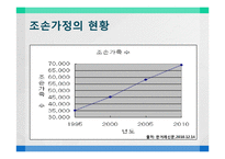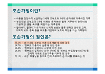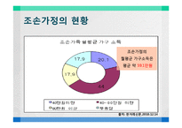 목차 1. 조손가정은 사회적 문제인가? 2.조손가정이란? 3.조손가정의 원인은? 4. 조손가정의 현황 5. 조손가정이 겪는 어려움 6.광명종합사회복지관의 실제 사례 7.사례 8.사례를 통해 살펴 본 문제점 9.사례에 대한 실제 개입내용 10.조부모를 위한 지원정책 11.손자녀를 위한 지원정책 12.조손가족 정책의 한계점 13.앞으로의 과제 및 발전방향 본문 1. 조손가정은 사회적 문제인가? YES 빈곤의 악순환과 조손가족이 결합되는 경우가 대부분이라는 점 사회적 약자로 인식되는 구성원들의 결합이라는 점 일시적으로 구성된 가족 유형이 아닌, 아동이 성장할 때까지 지속적인 경우가 대부분이라는 점 조손가정이란? 아동을 전담하여 보살피는 1세대 조부모와 3세대 손자녀로 이루어진 가족 부모대신 조부모가 18세 이하의 손자녀와 함께 거주하며 손자녀의 기본적인 생활 욕구를 책임지는 가족형태 할아버지, 할머니가 손자녀의 신체적 보호는 물론 양육과 관련된 교육, 의학적 보호, 훈육 등을 부모를 대신하여 보호와 책임을 지는 가족형태 키워드 정책학, 가족, 복지, 조손, 가정, 조손가정 |
