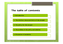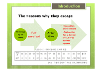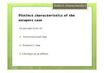 목차 1. Introduction 2. The distinct characteristics of the escaper 3. The policy for the escaper 4. The problem of the policy and solution 5. Discussion & Conclusion 본문 The reasons why we choose this topic Special Case only in Korea Distinct Characteristics from other Cultural Minority The Number of Escapers is increasing Not covered in class Distinct characteristics of the escapers case In perspective of International law Domestic law Ideological problems 참고문헌 박현선, "탈북자 국내 정착정책의 현황과 발전방향", 「북한연구학회보」 제6권 제1호, 2002 임정규, "북한이탈주민의 지원정책", 대전대학교 박사논문, 2004 http://www.unikorea.go.kr/CmsWeb/viewPage.req?idx=PG0000000168 키워드 escaper, 탈북자 정책, 규범, 분석, 영문 |