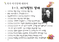 목차 1. 작가 이기영에 대하여 개인적 생애 작가의 삶과 당시 시대 모습의 매치 2.시대적 배경 3.작품 특징 프로문학이란 리얼리즘이란 문제적 인물의 성격과 역할 전형의 집단 창조와 예술 안승학의 인물 분석 인물 대립 구조 본문 1-2. 이기영의 삶과 당시 시대 모습의 매치 이기영이 출생한 시기(1986)명성 황후 시해 사건인 을미사변에 이어, 아관파천이 감행된 해 집안의 몰락 이기영의 집안도 조부 대에는 소지주의 행세를 하던 것이 아버지 대에 이르러서는 완전히 몰락하여 소작농의 처지로 떨어져 극도의 빈곤과 가난한 유년기를 보냄 이기영의 문학적 출발 가난이라는 현실 속에 이기영은 고대 영웅 소설의 주인공을 동경하여 문학에 심취하게 되는데 이는 문학을 소박한 자기 위안의 수단으로 인식하는 낭만주의적인 단계에서 그가 출발하였음을 말해 줌 키워드 생애, 이기영, 인문학, 작가, 작품, 고향, 프로문학, 리얼리즘 |