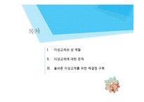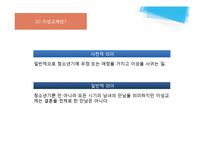 목차 이성교제와 성 역할 이성교제에 대한 문제 올바른 이성교제를 위한 해결점 구축 본문 (1) 이성교제란? 사전적 의미 일반적으로 청소년기에 우정 또는 애정을 가지고 이성을 사귀는 일. 일반적 의미 청소년기뿐 만 아니라 모든 시기의 남녀의 만남을 의미하지만 이성교제는 결혼을 전제로 한 만남은 아니다. John Gray의 정의 매력 반신반의 선택 친밀감 결혼 매력을 느끼는 단계 상대방을 반신반의 하는 단계 결정적인 한 사람을 선택해 교제하는 단계 강한 친밀감을 느끼는 단계 결혼을 약속하는 단계 키워드 이성교제, 이성, 교제, 성역할, 연구 |