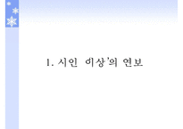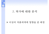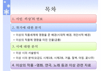 목차 1. 시인 '이상'의 연보 2. 작가에 대한 분석 이상의 작품세계에 영향을 준 배경(시대적 배경, 개인사적 배경) 이상의 작품에 영향을 미친 인물(금홍) 3. 시에 대한 분석 이상 시의 서술방식 이상 시의 분석(오감도 시제1호, 시제2호, 거울, 절벽, 아침 ,꽃나무) 4. 이상의 작품 영화, 연극, 노래 등과 이상 관련 자료 본문 시대적 배경 이상 생년월일- 1910년 9월 23일 (음력 8월 20일) 일제 강점기가 시작되는 시기 본격적인 작품활동 시작한 1930년- 일제 억압이 심해졌던 시기 1930년대 현실과 시대적 상황 ->절망과 불안 의식->죽음 의식 표상 개인사적 배경 궁핍했던 집안 환경 탓에 가족과 함께 살지 못했던 유년시절의 비극적인 기억 사랑하는 여인 '금홍'을 떠나 보내야 했던 비극 22살 폐결핵을 앓으며 죽음의 두려움과 맞서 싸워야 했던 비극 키워드 이상, 이상의, 배경, 개인사적, 분석 |