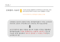 목차 1.서론 2.본론 콩쥐팥쥐설화 1. 보편성 2. 특수성 3. 콩쥐팥쥐설화 기본형 소개 드라마 찬란한유산 4. 드라마 소개 -콩쥐팥쥐설화와 드라마 찬란한유산 비교 5.공통점 6.차이점 3.결론 본문 신데렐라 스토리? 시간과 공간을 초월하여 전 세계적으로 걸쳐 분포, 전승 여러 언어권 내에서 비슷한 구조의 설화들이 구전됨 우리나라에서는 콩쥐팥쥐 설화로 존재 신데렐라스토리의 유형에 속하는 콩쥐팥쥐설화가 가지는 보편성과 우리나라 고유의 구비문학으로서 나타나는 특수성을 알아봄 ↓ 조선시대부터 많은 사랑을 받으며 수많은 이본을 창출해낸 콩쥐팥쥐설화가 현대 문화에서는 어떻게 수용되고 있으며 스토리 전개 양상에서 차이가 있다면 그 이유는 무엇인지 논의하고자 함 참고문헌 엄수경, 『<콩쥐팥쥐>전래동화의 설화 수용양상 고찰』, 남도민속학회, 남도민속연구 제13집, 2006. 이원수, 『콩쥐팥쥐 설화 연구』, 문학과언어학회, 문학과언어 제19집, 1997. 오윤선, 『세계의 신데렐라유형 이야기군 속에서의 콩쥐팥쥐 이야기 고찰』, 건국대학교 동화와번역연구소, 2006. 남종현, 『콩쥐팥쥐전이야기. <콩쥐팥쥐전><신데렐라>의 상관관계』, 세명대학교 대학원, 2008. 오윤선,『세계의 신데렐라유형 이야기군 속에서의 <콩쥐팥쥐 이야기> 고찰』, 건국대학교 동화와번역연구소, 2006. 조희숙 석선화, 『콩쥐팥쥐와 신데렐라 비교연구』, 부산대학교 영유아보육연구소, 2003. 키워드 콩쥐팥쥐설화, 콩쥐팥쥐, 설화, 드라마, 한유산 |
