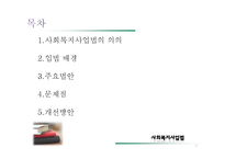 목차 1.사회복지사업법의 의의 2.입법 배경 3.주요법안 4.문제점 5.개선방안 본문 1.사회복지사업법의 의의 사회복지사업법은 사회복지서비스 분야에 관한 입법들의 일반법, 기본법 사회복지를 필요로 하는 사람의 인간다운 생활을 할 권리 보장 사회복지의 전문성 향상, 사회복지사업의 공정.투명.적정을 기함, 지역사회복지의 체계 구축 사회복지사업법이 다루는 주요 법안 사회복지를 분야별로 다루 는 사회복지서비스법을 기 본적으로 규정하는 법안 사회복지사업에 관한 기본 적사항 규정 사회상황에 따라 새로운 법안 추가되어 개정 때문에 수많은 법안이 속해있고 이로 인해 특정한 법안이 가장 주요하다고 할 수는 없다. 키워드 개선방안, 사회복지, 복지, 사회, 사회복지사업법 |