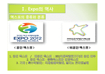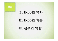 목차 Ⅰ. Expo의 역사 Ⅱ. Expo의 기능 Ⅲ. 정부의 역할 본문 Ⅰ. Expo의 역사 엑스포(Expo)란? 여수 엑스포 대전 엑스포 이후 두번째로 열리는 공인 엑스포 -> 공인 엑스포로서 많은 기대를 받고 있다. 국제적인 규모와 체제를 갖추어 개최되는 박람회 엑스포는 세계 박람회(World s Fair), 만국 박람회(Universal Expositions)로도 불림 인류 상호간의 이해와 복지향상, 인류의 비전 제시의 목적 ★ 참가국의 국가종합홍보를 위한 세계적 규모의 경제/문화 올림픽 키워드 정책론, Expo, 역할, 정부, 기능 |