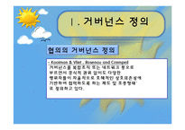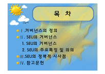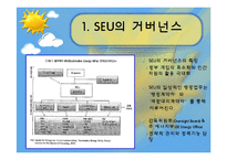 목차 Ⅰ.거버넌스의 정의 Ⅱ. SEU의 거버넌스 1. SEU의 거버넌스 2. SEU의 주요특징 및 의의 Ⅲ.SEU의 정책적 시사점 Ⅳ. 참고문헌 본문 Ⅰ. 거버넌스 정의 협의의 거버넌스 정의 - Kooiman & Vliet , Rosenau and Czempeil 거버넌스를 복합조직 또는 네트워크 등으로 부르면서 공식적 권위 없이도 다양한 행위자들이 자율적으로 호혜적인 상호의존성에 기반하여 협력하도록 하는 제도 및 조종형태' 로 정의하고 있다. 광의의 거버넌스 정의 - Stoker, 1998 개념은 정부중심의 공적 조직과 사적 조직의 경계가 무너지면서 나타난 새로운 상호협력적인 조정양식을 의미하는 것으로 파악한다. 참고문헌 국회예산정책처, 「지방자치단체 재정난의 원인과 대책」, 2010 국회예산정책처, 「2010년 수정 경제전망 및 재정분석-글로벌 금융위기 이후 중기 재정정책의 방향」, 2010 국회예산정책처, 「신재생에너지보급사업 평가」, 2010 국회도서관 논문참조, 「기후변화 대응을 위한 미국의 뉴거버넌스 SEU와 정책적 시사점」, 2010 키워드 기후변화, 시사점, 뉴거버넌스, 변화, 기후, SEU |