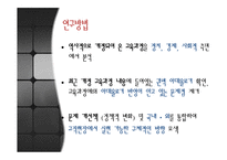 목차 1.서 론 연구주제 및 개관 연구방법 2.본 론 우리나라의 사회적 변동 요인과 교육과정 변천사 최근 개정 교육과정의 지배적 이데올로기와 가치관, 확인 방법 및 문제점 문제점 개선책과 국내외 사례 3.결 론 연구에 대한 결과 및 제언 본문 연구주제 및 개관 현대사회의 인간은 교육이 필요, 교육 속에서 자율성과 주체의식을 가지게 됨 간섭이나 영향으로 인해 특정의 수단이 될 수 없다. ∴ 교육은 가치중립적이어야 함. But, 우리 현재의 교육은 교육내용에 지배계급의 이데올로기가 반영 → 지배계급의 정당성 확보, 사회 지배의 수단으로 주입 연구방법 역사적으로 개정되어 온 교육과정을 정치, 경제, 사회적 측면에서 분석 최근 개정 교육과정 내용에 들어있는 권력 이데올로기 확인, 교육과정에의 이데올로기 반영이 안고 있는 문제점 제기 문제 개선책 (정책적 변화) 및 국내 외를 통합하여 교직현장에서 실현 가능한 구체적인 방향 모색 참고문헌 - 『사회변동에 따른 고등학교 사회과 교육과정 변화에 관한 연구』, 박지은, 2003 - 『고등학교 교육과정 해설』, 교육과학기술부, 2009 - 『고등학교『정치』교과서에 나타난 지배이데올로기 분석』, 안지은, 2009 - 『사회과 대안교과서의 지배이데올로기 분석:차세대 고등학교 경제교과서를 중심으로』 최준호, 2009 - 『신보수주의 교육개혁 이후 사회 교과 위상의 변화와 도전 영국과 미국의 사례를 중심으로-』, 김영석, 2009 - 『2009 개정 사회과 교육과정에 대한 비판적 검토』, 변진언, 2010 키워드 교육공학, 교과서, 문제점, 영교육, 교과서속 |